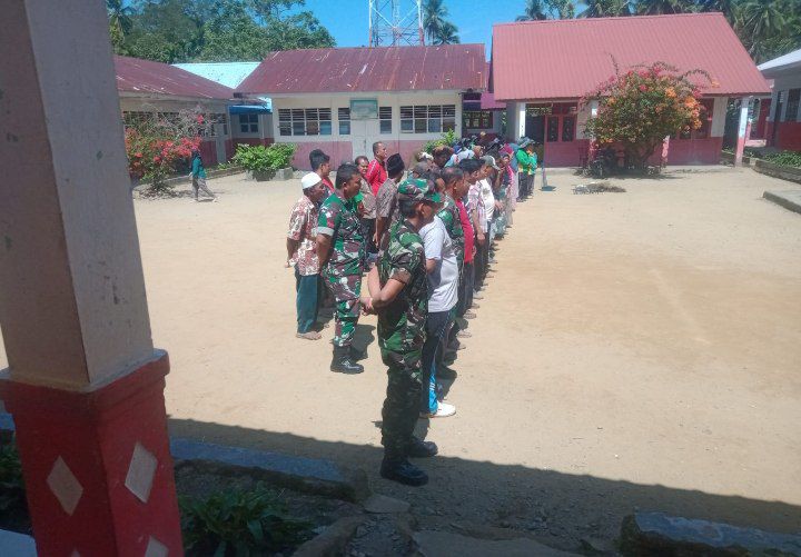 Terlihat para Babinsa dan aparat kecamatan bersama warga melakukan gotong-royong pembersihan sampah dan rumput liar sebagai upaya menciptakan lingkungan yang bersih dan sehat