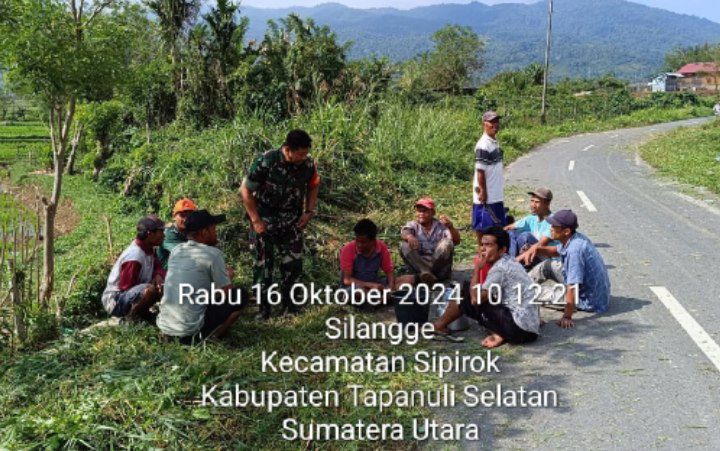 Sipirok – Babinsa Koramil 03/Sipirok Kodim 0212/Tapsel Serka Nyono Purnomo bersama warga masyarakat desa binaan melaksanakan gotong royong pembersihan pangkas rumput di kanan kiri jalan di desa Pahae Aek Sagala Kecamatan Sipirok Kabupaten Tapanuli Selatan, Rabu (16/10/2024)