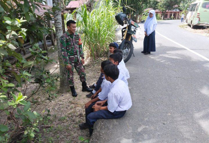 Dalam kesempatan ini, Babinsa Sertu KSJ. Pardosi mendapati dan menyapa beberapa anak sekolah yanag sedang berkumpul di pinggir jalan pada jam belajar sekolah