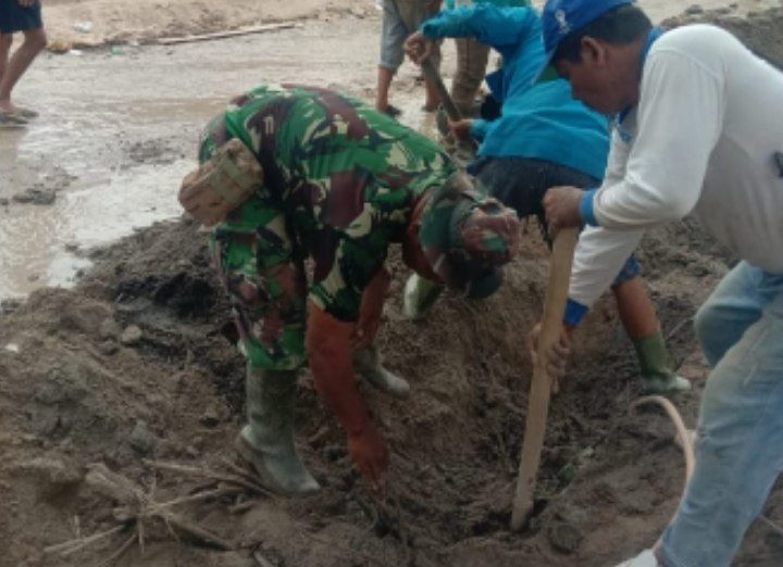 Babinsa Serka Tunggul Panggabena mengatak, pihaknya bersama masyarakat Desa binaan melaksanakan aksi bersih atau gotong-royong untuk membersihkan parit dari timbunan tanah dan lumpur pasca terjadinya banjir akibat hujan