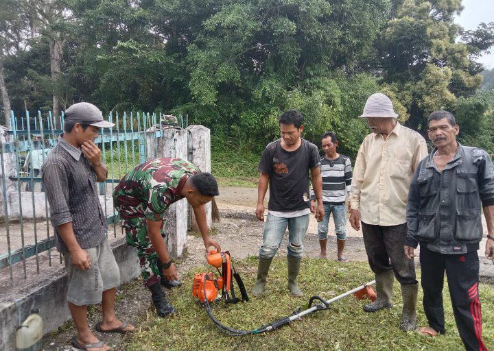 Sipirok - Babinsa Koramil 03/Sipirok Kodim 0212/Tapsel Serda Ahmad Khozali Siregar bersama dengan Warga Desa Padang Bujur melaksanakan gotong-royong pembersihan lingkungan dengan sasaran pemotongan rumput liar di Desa Padang Bujur Kecamatan Sipirok Kabupaten Tapanuli Selatan, Selasa (14/01/2025)