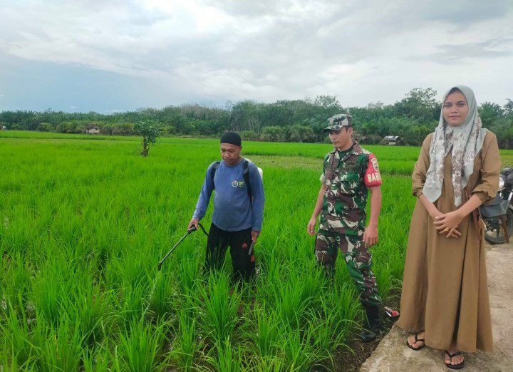 Natal - Babinsa Koramil 17/Natal Kodim 0212/Tapsel Praka Anafoli Laoli bersama PPL melaksanakan kegiatan pendampingan kepada petani melakukan penyemprotan hama tanaman padi sawah di Desa Bonda Kase Kecamatan Natal Kabupaten Mandailing Natal, Senin (27/01/2025)