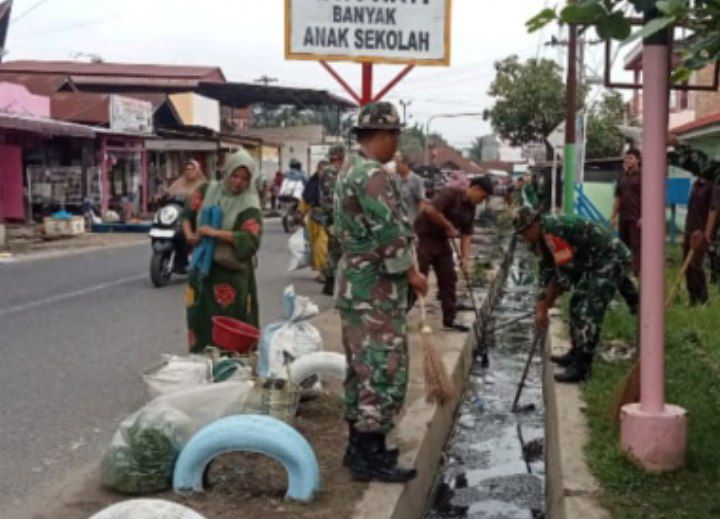 Padang Bolak – Babinsa Koramil 05/PB Kodim 0212/Tapsel dipimpin Serka Batara Harahap melaksanakan kegiatn gotong royong pembersihan saluran air bersama warga masayarakat di SImpang Portibi Lingkungan I Kelurahan Pasar Gunung Tua Kecamatan Padang Bolak Kabupaten Tapanuli Selatan, Sabtu (22/02/2025)