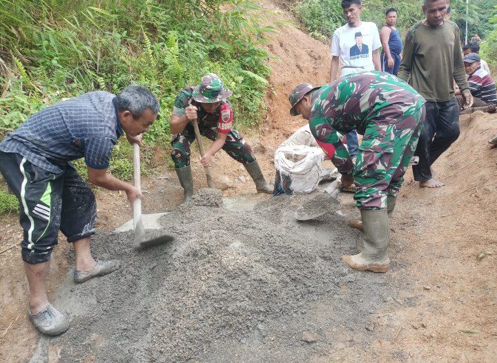 Panyabungan Selatan - Babinsa Koramil 13/Panyabungan Kodim 0212/Tapsel Sertu Albaini bersama warga masyarakat setempat melaksanakan kegiatan gotong royong untuk memperbaiki dan mengecor jalan yang rusak di Roburan Kecamatan Panyabungan Selatan Kabupaten Mandailing Natal, Minggu (23/02/2025)
