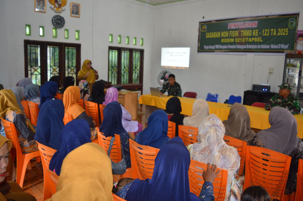 Dansatgas TMMD ke-123 tahun 2025 Kodim 0212/Tapsel melalui Pasi Teritorial Lettu Inf M. Rambe mengatakan, melalui Sosialisasi ini masyarakat diajarkan bagaimana menciptakan keluarga yang berkualitas dalam pencegahan stunting dengan melibatkan para tokoh agama dan lapisan masyarakat