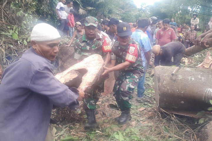 Dari pantauan di lapangan tampak Personel TNI dari Koramil 19/Siais Kodim 0212/Tapsel dan masyarakat setempat bahu membahu melakukan evakuasi pohon tumbang dengan menggunakan Senzo, parang dan alat peralatan lainnya