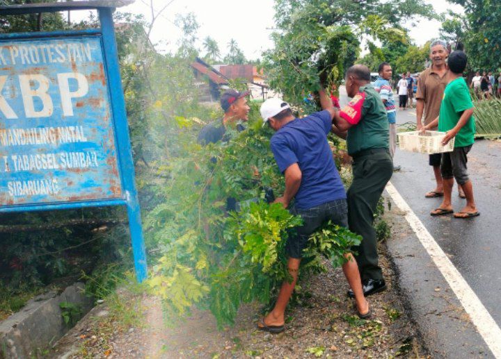 “pagi ini terjadi pohon tumbang bahkan menutup akses jalan, jadi bersama warga setempat langsung kita aksi lakukan evakuasi” ungkap Babinsa Serka Suadiaman Harefa