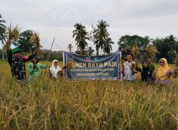 Bukit Malintang – Dalam upaya mendukung program swasembada pangan, Koramil 12/Siabu Kodim 0212/Tapsel dipimpin Peltu Sulhan Panjaitan bersama Forkopimcam Bukit Malintang dan Kelompok Tani Karya Tani 3 Desa Malintang Julu melaksanakan kegiatan Panen Raya Padi di area Persawahan Desa Desa Malintang Julu Kecamatan Bukit Malintang Kabupaten Mandailing Natal, Sabtu (22/03/2025)