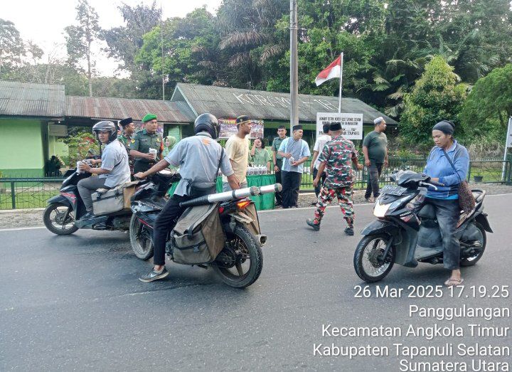 Angkola Timur – Bertempat di depan Makoramil 18/Pargarutan Kelurahan Pasar Pargarutan Kecamatan Angkola Timur Kabupaten Tapanuli Selatan, Anggota Koramil 18/Pargarutan Kodim 0212/Tapsel dipimpin Batuud Peltu Habib melaksanakan kegiatan Ramadhan Berkah berbagi takjil kepada pengguna jalan