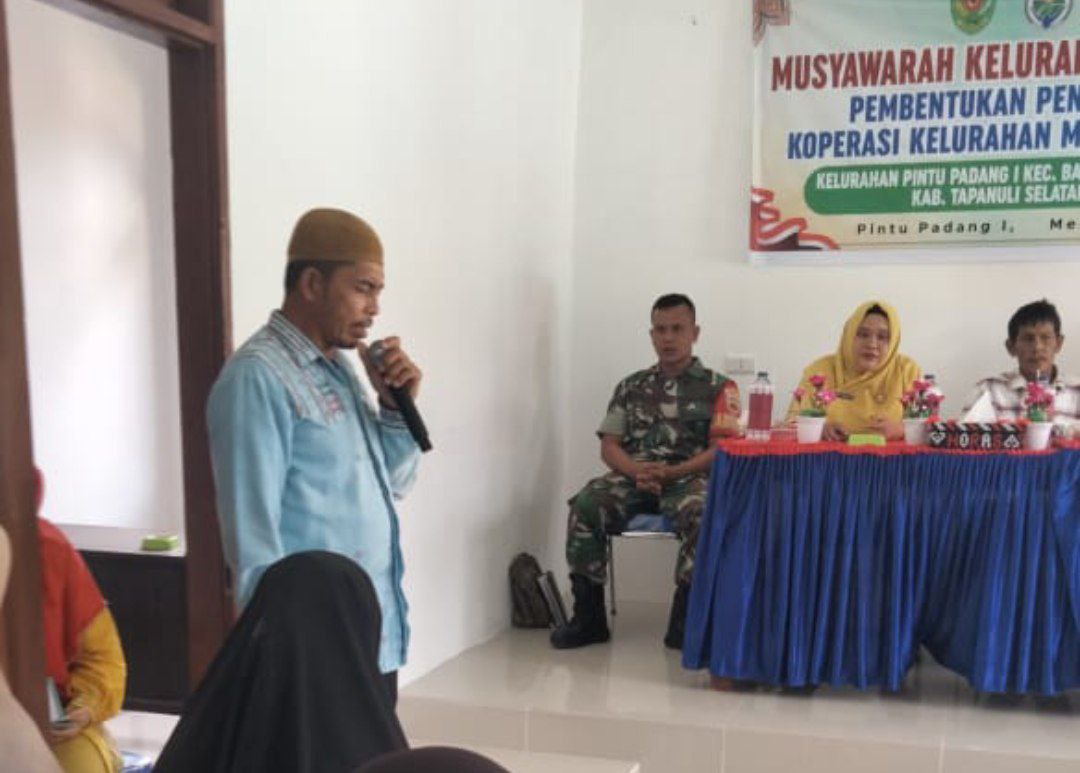 Batang Angkola – Sertu Aziz Lubis, Babinsa Koramil 11/BA Kodim 0212/Tapsel menghadiri kegiatan Musyawarah Kelurahan Khusus (Muskelsus) dalam rangka pembentukan Koperasi Merah Putih Kelurahan Pintu Padang I dan pengurusnya di Kantor Kelurahan Pintu Padang I Kecamatan Batang Angkola Kabupaten Tapanuli Selatan, Kamis (22/05/2025)