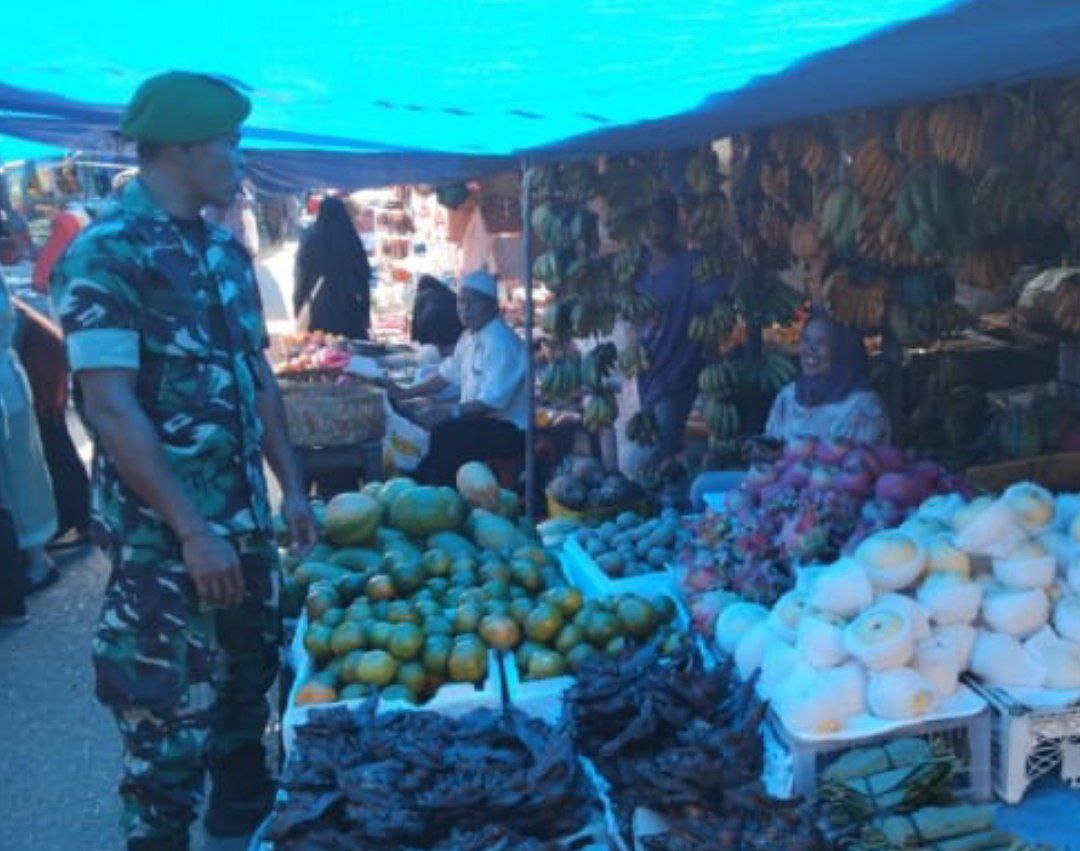Dalam kegiatan tersebut, Babinsa Serma Andoko berkeliling memonitor situasi pasar dan menanyakan tentang ketersediaan dan harga beberapa bahan pokok sembaki kepada para pedagang pasar