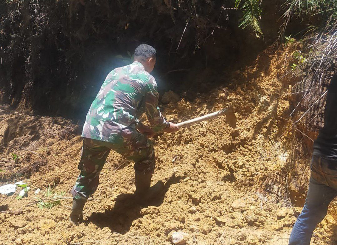 Angkola Sangkunur – Babinsa Koramil 19/Siais Kodim 0212/Tapsel Serda Ali Amransyah Dalimunthe bersama warga melaksanakan gotong royong secara swadaya perbaikan jalan yang rusak di Desa Bandar Tarutung Kecamatan Angkola Sangkunur Kabupaten Tapanuli Selatan, Sabtu (14/06/2025)