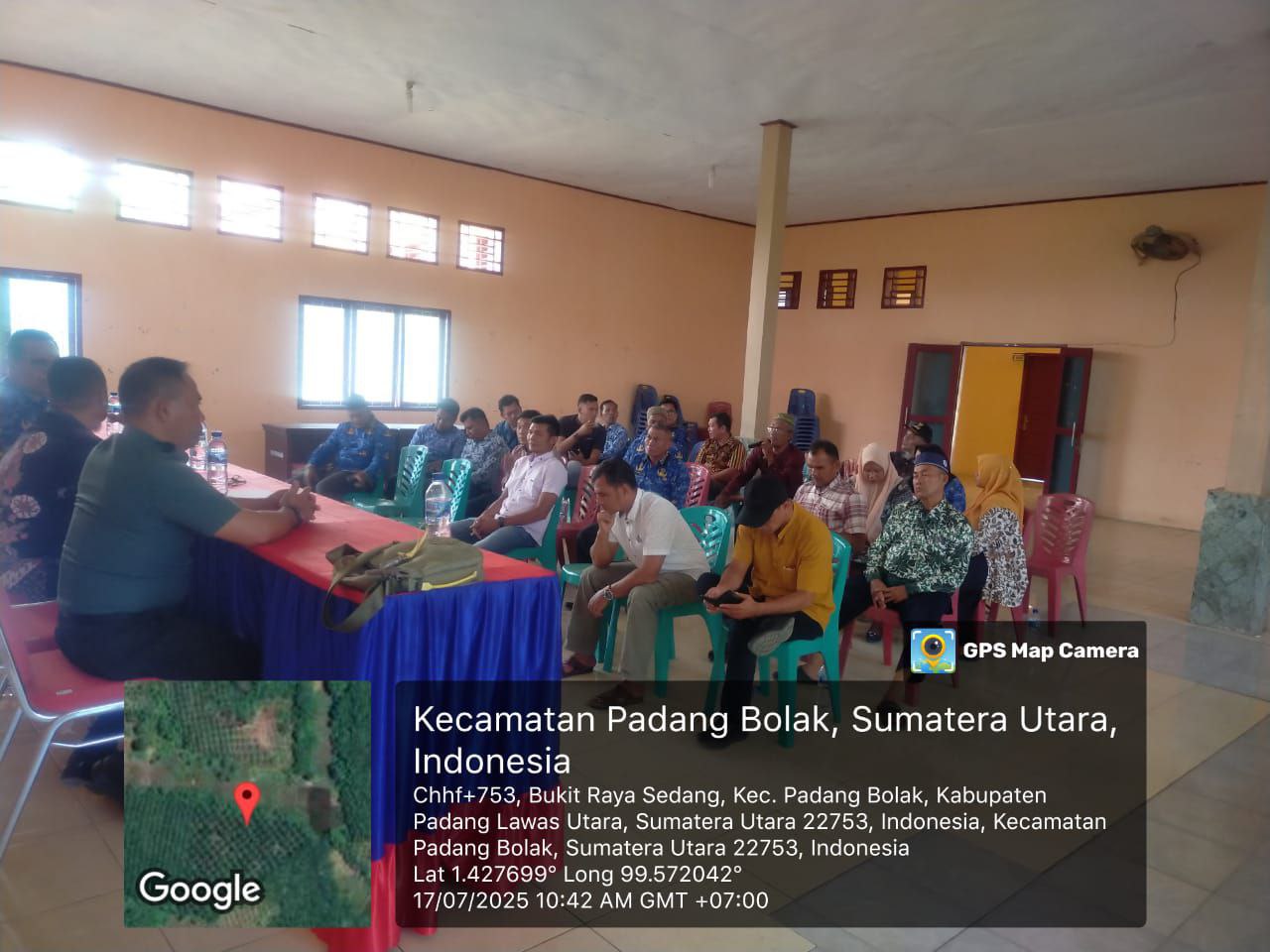 Padang Bolak Tenggara – Babinsa Koramil 05/PB Kodim 0212/Tapsel Serka Adi Susanto melaksanakan kegiatan Rapat bersama apparat pemerintah dan stakeholder Kecamatan Padang Bolak tenggara dalam rangka pembentukan Panitia peringatan HUT RI ke-80 yang dilaksanakan di Aula Kantor Camat Padang Bolak Tenggara Kabupaten Padang Lawas Utara, Kamis (17/07/2025)