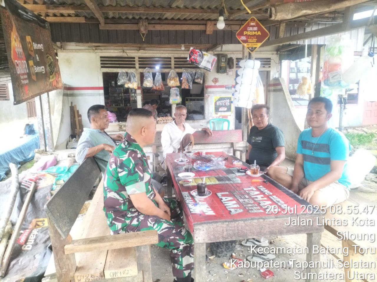 Batang Toru – Babinsa Koramil 01/Batang Toru Kodim 0212/Tapsel Serka Khairul Siregar melaksanakan kegiatan monitor wilayah guna menjaga kondusifitas wilayah sekaligus melaksanakan Komsos (Komunikasi Sosial) dengan warga desa binaan di Desa Padang Lancat Sisoma Kecamatan Batang Toru Kabupaten Tapanuli Selatan, Minggu (20/07/2025)