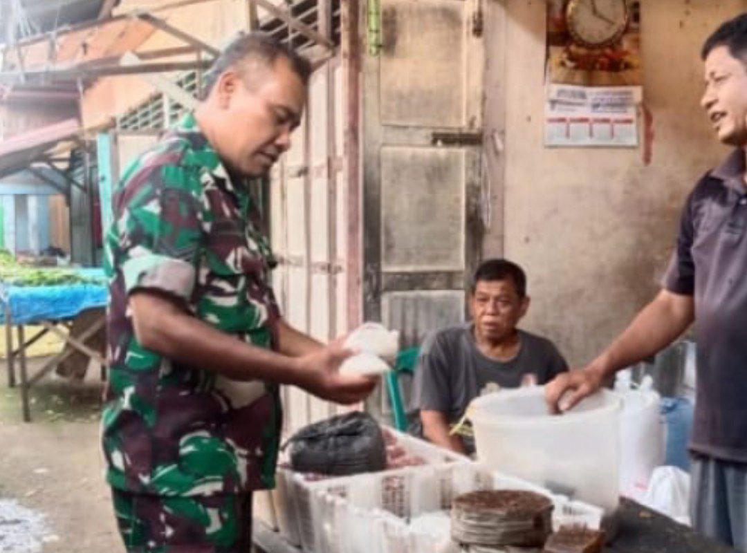Babinsa Koramil 10/Barteng Pantau Sembako dan Komsos dengan Pedagang di Pasar Binanga