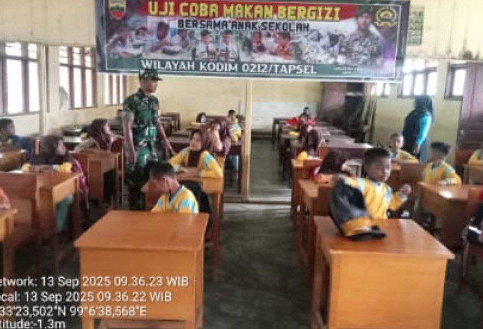 Natal – Dalam rangka mendukung dan mensukseskan program pemerintah meningkatkan kesejahteraan masyarakat melalui program makan bergizi gratis, Koramil 17/Natal Kodim 0212/Tapsel dipimpin Danramil 17/Natal Lettu Inf Eman Sutrisno melaksanakan uji coba makan bergizi gratis di SDN 362 Natal Kecamatan Natal Kabupaten Mandailing Natal, Sabtu (13/09/2025)