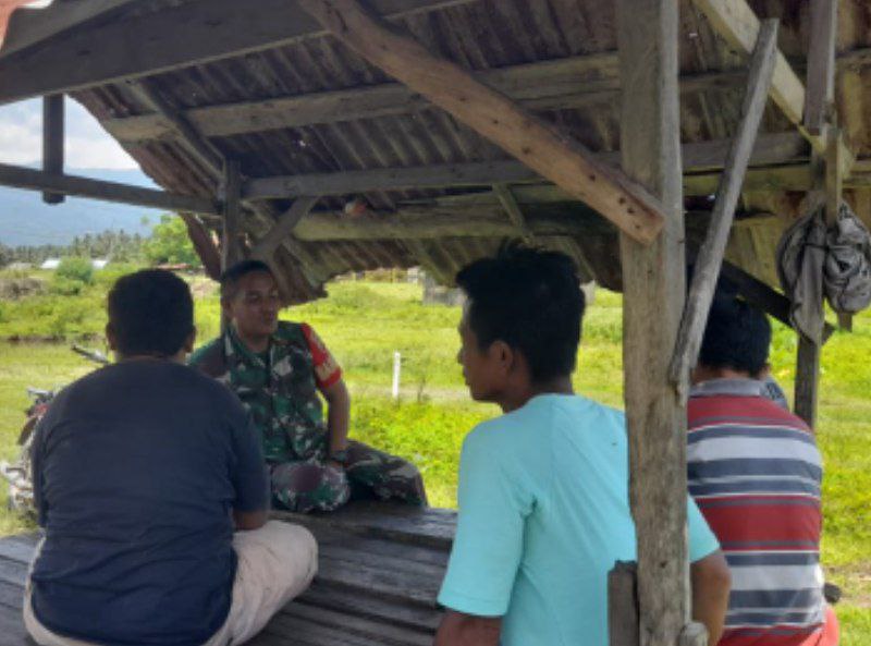 Dalam kegiatan Komsos tersebut, Babinsa Koptu RP. Rangkuti menyambangi beberapa warga yang sedang berkumpul dan berbincang-bincang dengan mereka tentang bahaya Karhutla.