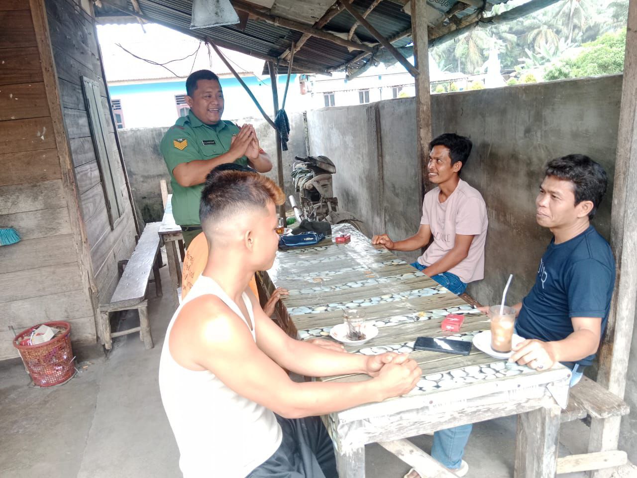 Keakraban tersebut terlihat saat Babinsa Serma Dulbert menyapa dan duduk bersama dengan beberapa orang warga masyarakat di sebuah warung kopi