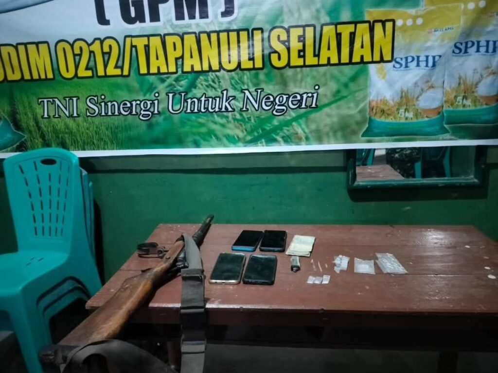 Adapun penangkapan bandar dan pengedar narkoba ini, yang mana anggota unit Intel Kodim 0212/Tapsel berhasil mengamankan 2 orang tersangka berinisial SBI 55 Tahun warga Tran Duc Kec. Rambah Hilir Kab. Rokan Hulu Provinsi Riau dan LL 25 Tahun warga Desa Hili Dauli Kec. Susua Kab. Nias Selatan, Narkotika jenis sabu-sabu seberat 0,52 gram, uang sejumlah Rp 450.000,-, HP 4 buah, kaca pirek 1 buah, plastik klip kecil 2 bungkus, korek mancis 1 buah, dompet 1 buah dan senjata api rakitan 1 pucuk