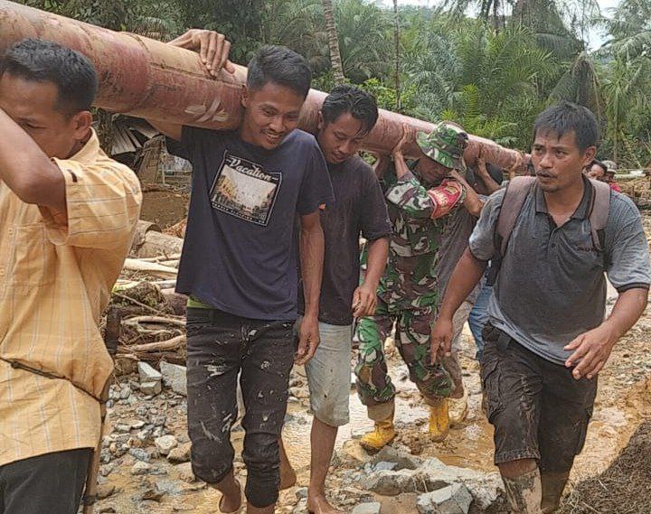 Angkola Sangkunur – Pasca bencana alam tanah longsor, Babinsa Koramil 19/Siais Kodim 0212/Tapsel Serda Amir Daulay bersama warga masyarakat membantu petugas dari PLN mendirikan tiang listrik untuk mempercepat perbaikan jaringan listrik di Desa Simatohir Kecamatan Angkola Sangkunur Kabupaten Tapanuli Selatan, Selasa (16/12/2025)
