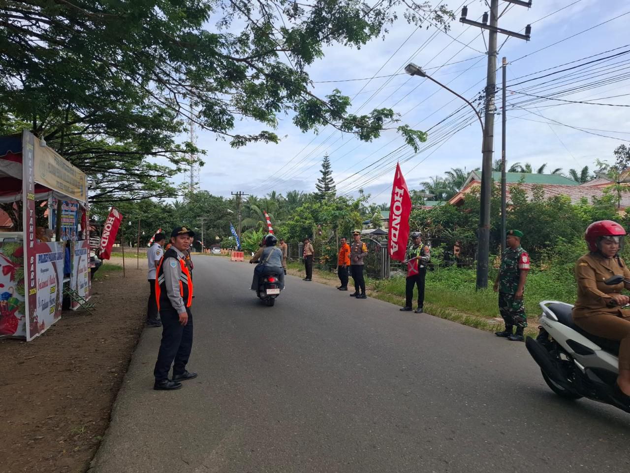 Sosa - Babinsa Koramil 09/Sosa Kodim 0212/Tapsel Sertu Hotman Idris Siregar dan Sertu Riswan Hasibuan melaksanakan Kegiatan Siaga Pengamanan Natal dan Tahun Baru (Nataru) bersama anggota Polres Padang Lawas, Satpol PP, Dishub dan Puskesmas, bertempat di Pos Pam II Desa Pasar Ujung Batu Kecamatan Sosa Kabupaten Padang Lawas guna memberikan rasa aman kepada warga pada libur Natal dan Tahun baru 2026. Senin (29/12/2025)