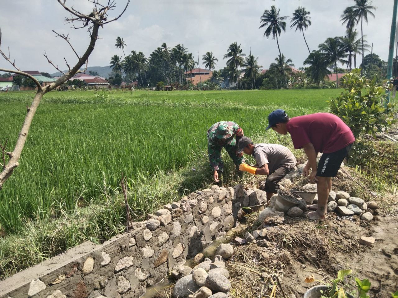 Padangsidimpuan - Babinsa Koramil 02/Kota Psp (Padasidimpuan) Kodim 0212/Tapsel Serka yahya melaksanakan kegiatan Pendampingan ketahanan pangan dan membantu warga dan petani membuat pondasi pembatas sawah di Lahan persawahan Poktan Dasniroha Kel.Timbangan Kec. Psp Utara Kota Padangsidimpuan, Senin (09/03/2026)