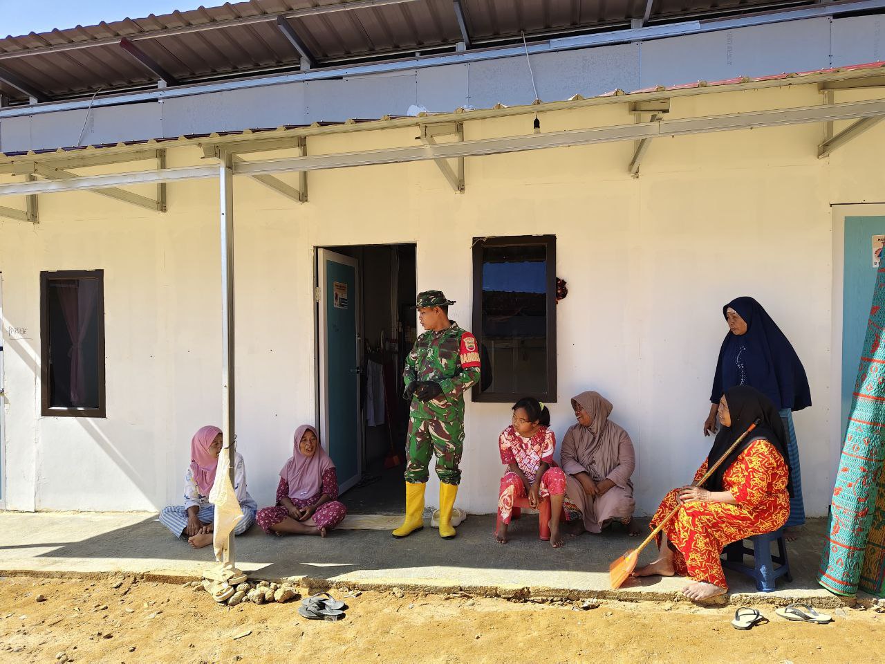 Dalam kegiatannya, Babinsa Serda Henri Sormin menyapa dan berbincang dengan beberapa warga khususnya Ibu-ibu yang berada di lokasi rumah Huntara
