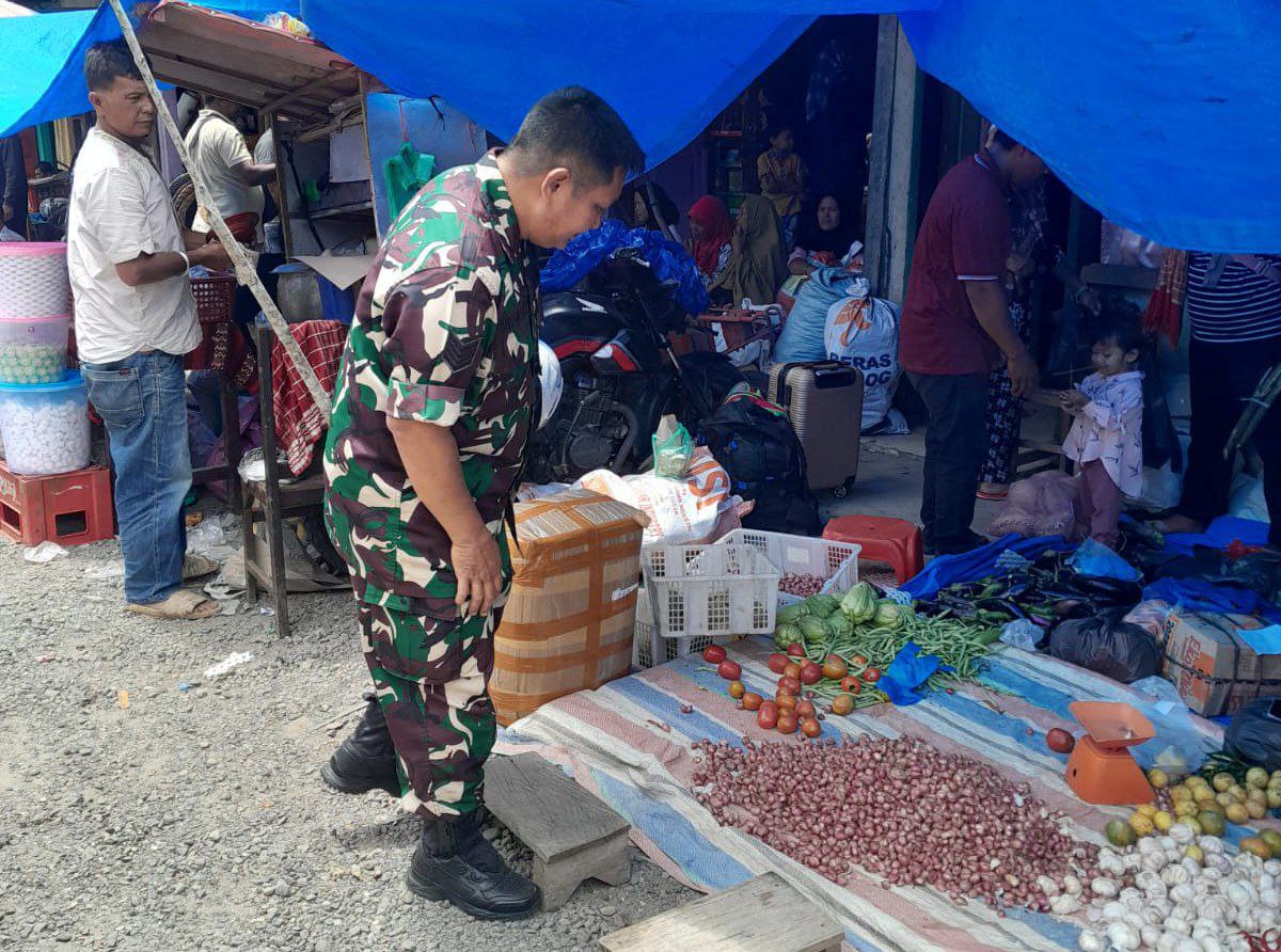 Saipar Dolok Hole - Menjelang hari raya Idul Fitri 1447 H, Babinsa Koramil 04/SDH Kodim 0212/Tapsel Serma Anton Pane melaksanakan monitoring dan pengecekan ketersediaan sembako serta harga sembako secara langsung di kios-kios dan pedagang yang ada di pasar tradisional di Kelurahan Aek Simotung Kecamatan Saipar Dolok Hole Kabupaten Tapanuli Selatan, Selasa (17/03/2026)