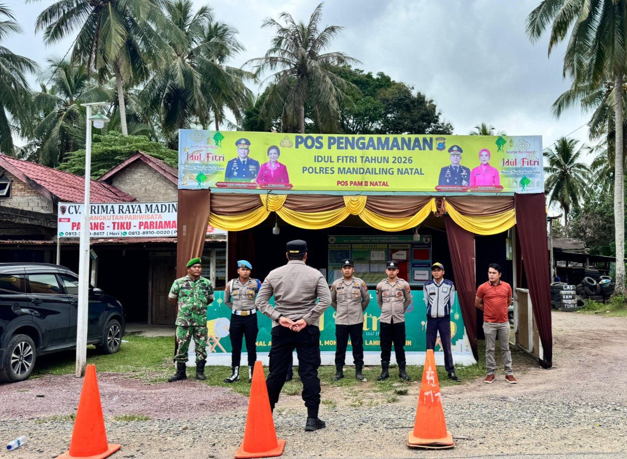 Natal - Koramil 17/Natal Kodim 0212/Tapsel Siagakan personel Babinsa Sertu M. Batubara dan Serda Afrizal untuk membantu pengamanan di Pos Pam II Polres Mandailing Natal di Desa Panggautan Kecamatan Natal Kabupaten Mandailing Natal, Selasa (24/03/2026)
